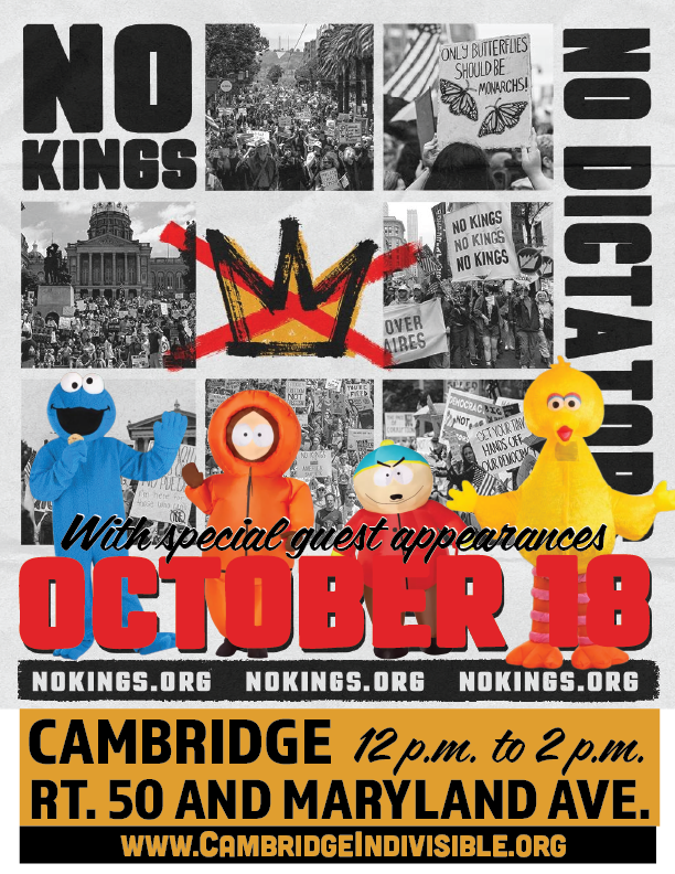 CAMBRIDGE, MD, UNITED STATES, October 16, 2025 /EINPresswire.com/ -- On Saturday, October 18, residents of Cambridge and communities across the Eastern Shore will gather for the No Kings Day of Peaceful Action, a nationwide mobilization affirming that America belongs to its people—not to kings or dictators.